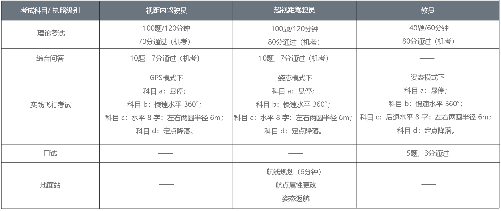 专业角度】:为了专业拍摄,无人机往往要承重几十公斤的设备,再加上无人机自身的重量,这绝不是天上飞着的一个玩具那么简单。现在的无人机已经基本上可以满足所有的拍摄需求,设备参数不是问题,真正会影响安全和质量的因素只有人,所以一个飞手应该经过系统的培训和实操训练。 Q2:无人机视距内驾驶员,超视距驾驶员,教员有什么区别? ◆